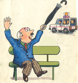 El viejo está muy contento en el banco. Dice "Adiós" a los ladrones y a los policías. Los ladrones están en el coche de policías. El coche tiene una sirena grande. Este viejo es un héroe