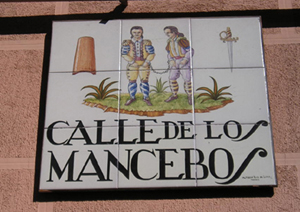 As best I can tell here is the story of this street and the sign. In 1217, Enrique I gets killed, supposedly by a tile falling off of the roof of his castle. Notice the tile in the top left of the street sign. The noblemen hid the truth about the death of the King. When his sister finds out about it she become Queen, but she almost immediately renounces the throne in favor of her son who becomes Ferdinand III.